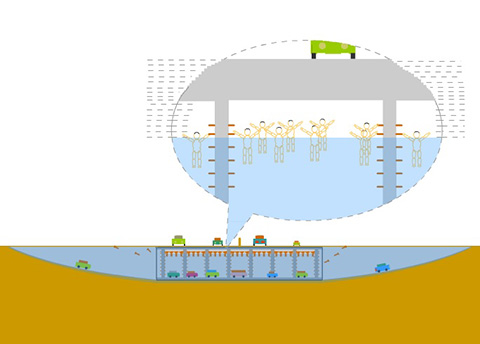 예시는 물이 가득한 경우에 구조물 상단 여러 부위에 공기 층이 생겨 얼마간 사람들이 공기를 흡입하면서 교각의 여러 손잡이에 의지하며 대피 등을 시도해 볼 수 있게하며, 이를 통해 구조원을 기다리던지 헤엄을 쳐 외부로 이동하는 등의 안전 대비에 좀 더 유효한 구조물을 이룬 모습입니다.