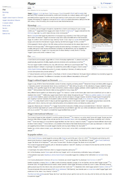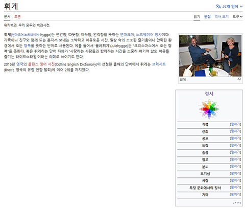 근래 휘게라는 용어가 있음을 알게 되었는데, wikipedia 에 소개된 모습과 같이 영어 사이트와 달리 한국어 사이트에 해당 컬러 정보가 연계 안내되어 정보의 부정 착시 가능성을 높임의 공유에 이르게 되는 현 모습에 대해 좀 의구심이 듭니다.